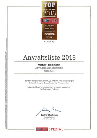 Rechtsanwalt Haizmann ist darüber hinaus Autor verschiedenster Publikationen, Leiter des Fachausschusses für Kapitalverbrechen beim deutschen Strafverteidiger-Verband und wurde seit 2014 bereits sechsmal hintereinander jährlich mit dem renommierten Titel „Top Rechtsanwalt“ durch das Focus Magazin ausgezeichnet und in die Focus-Liste der am häufigsten in Deutschland empfohlenen Rechtsanwälte aufgenommen.